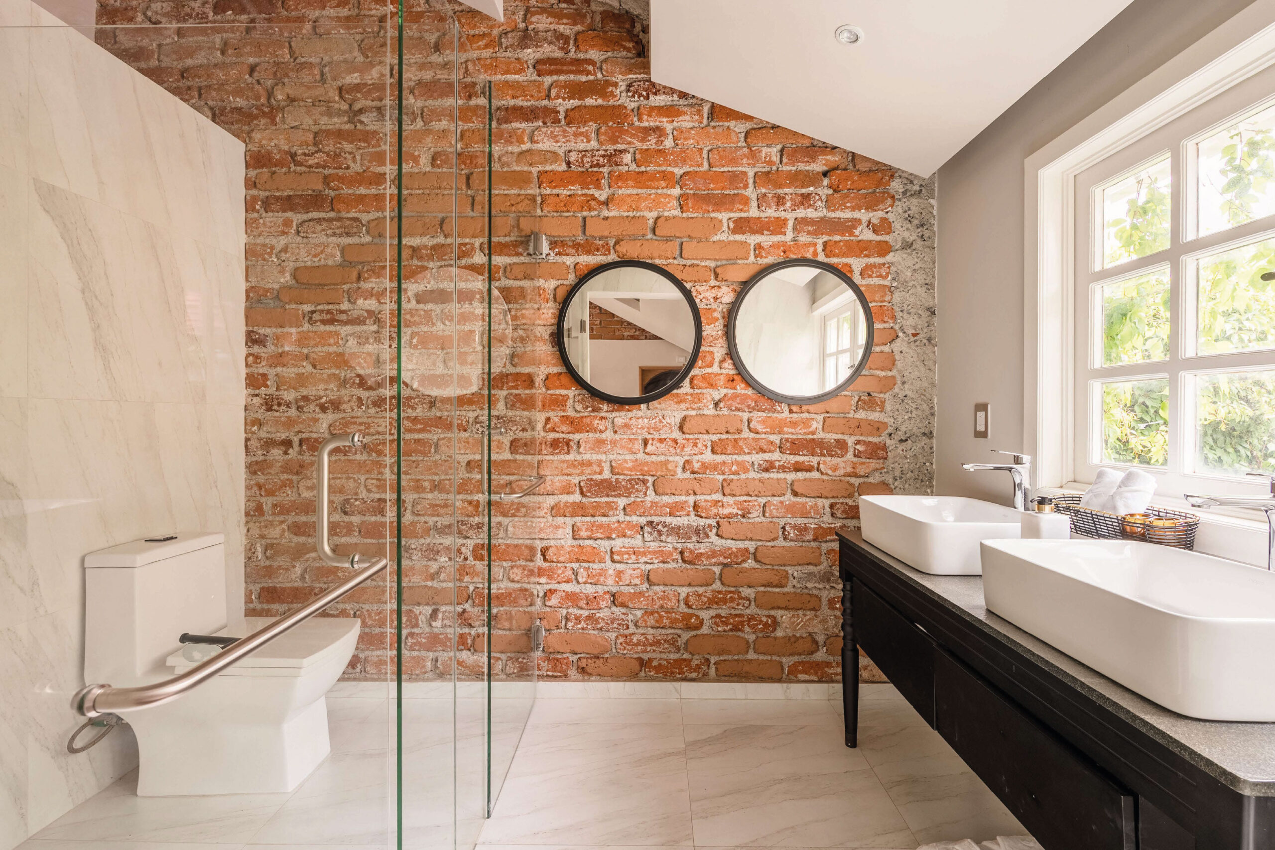 La Duraznos Suite es la más amplia y flexible de The Mark. Ideal para estancias largas o para quienes buscan amplitud, cuenta con una cama King Size frente a un muro de ladrillo que enmarca una pantalla de gran formato. La sala, ubicada junto a un ventanal tipo bow window, integra dos sillones y una mesa de centro que convierten el espacio en un rincón perfecto para leer, trabajar o simplemente relajarte. El baño cuenta con regadera de cristal y doble lavabo, mientras que el tapanco superior añade un toque arquitectónico único.