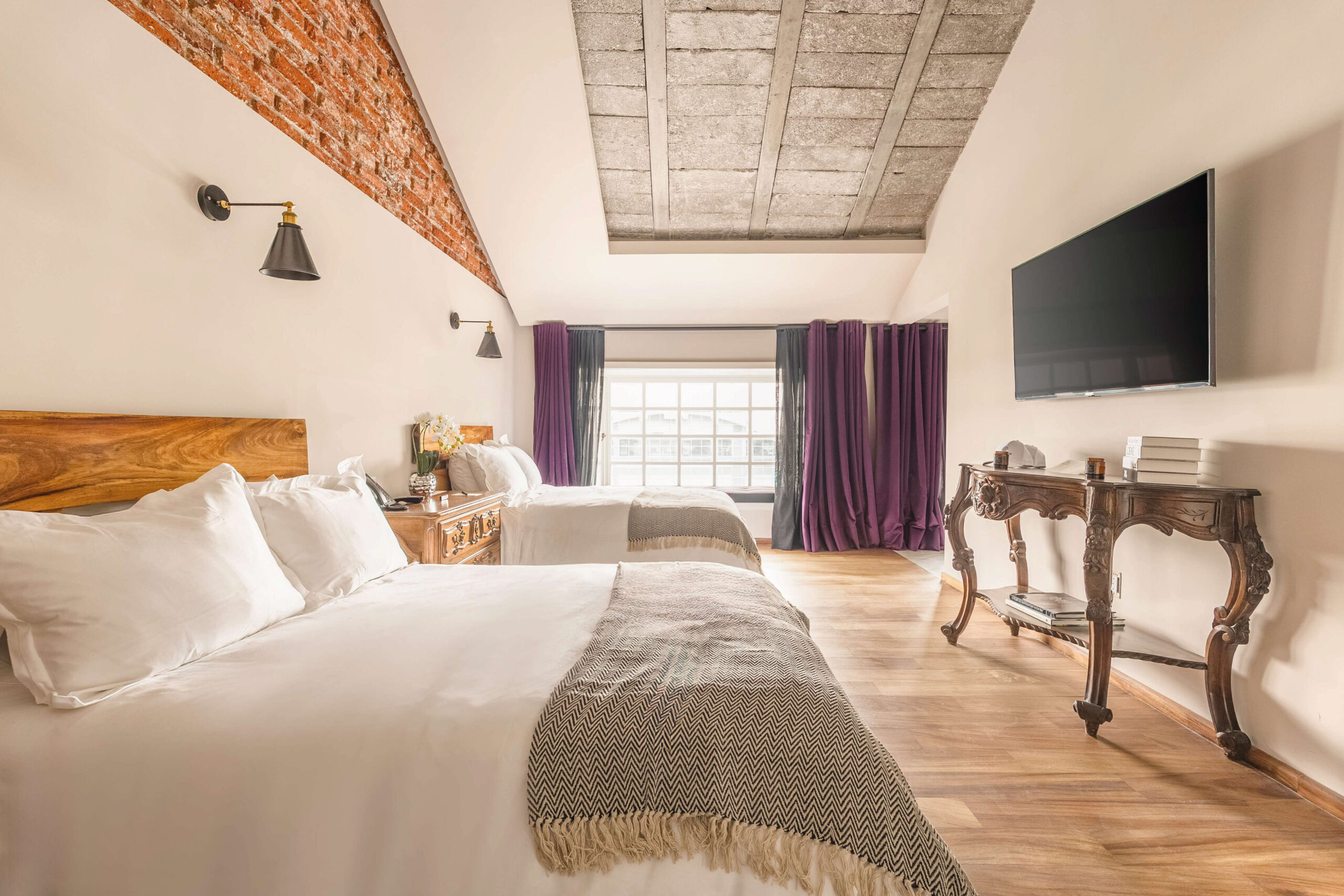 The Duraznos Suite is the most spacious and flexible suite at The Mark Hotel. Ideal for long stays or guests who value extra space, it features two double beds facing a large-screen TV and a convenient worktable. The lounge area, set beside a bow window, includes two armchairs and a coffee table—creating the perfect corner for reading, working, or simply relaxing. The bathroom is equipped with a glass shower and double sink, while the upper loft adds a unique architectural touch.