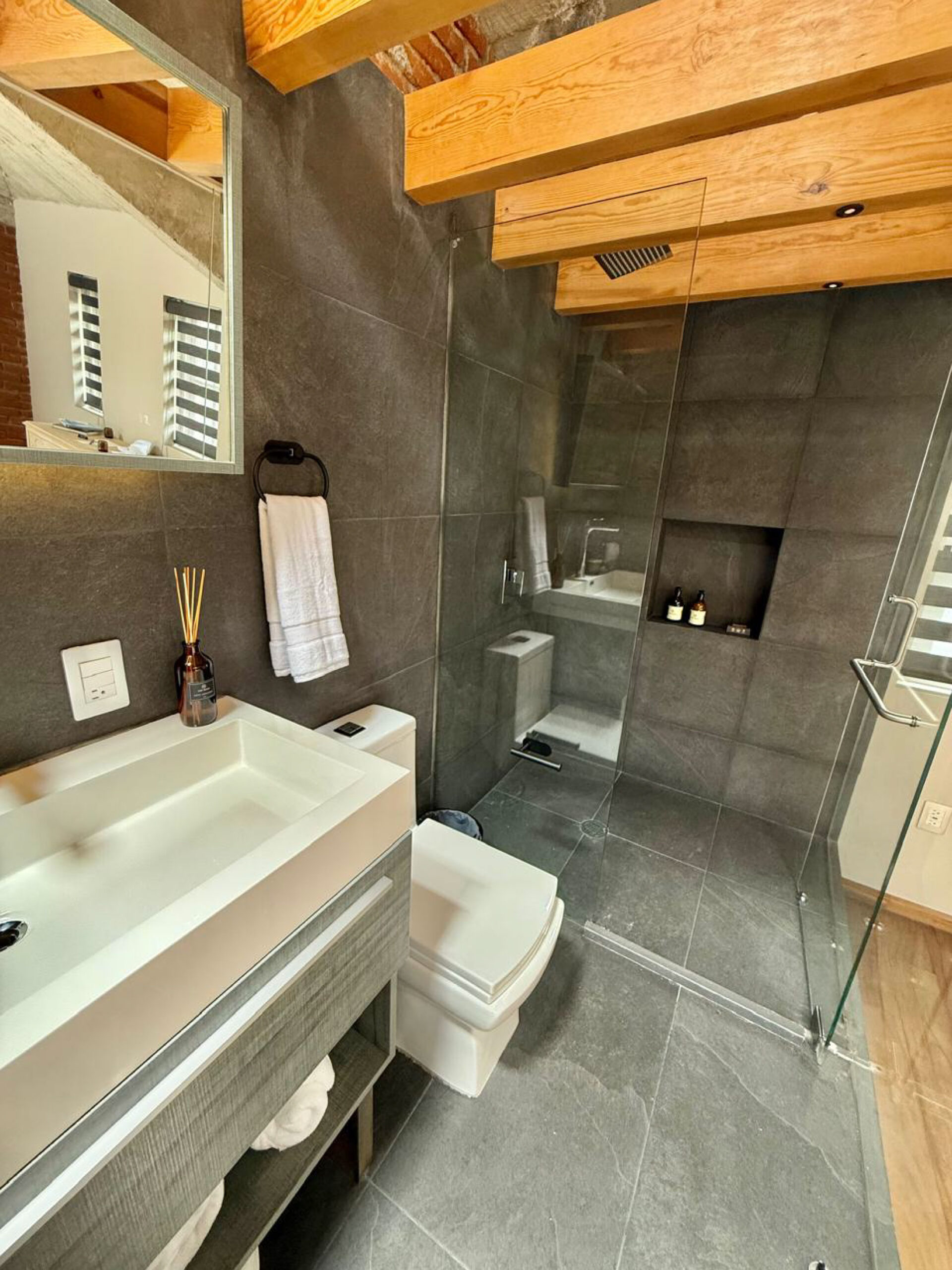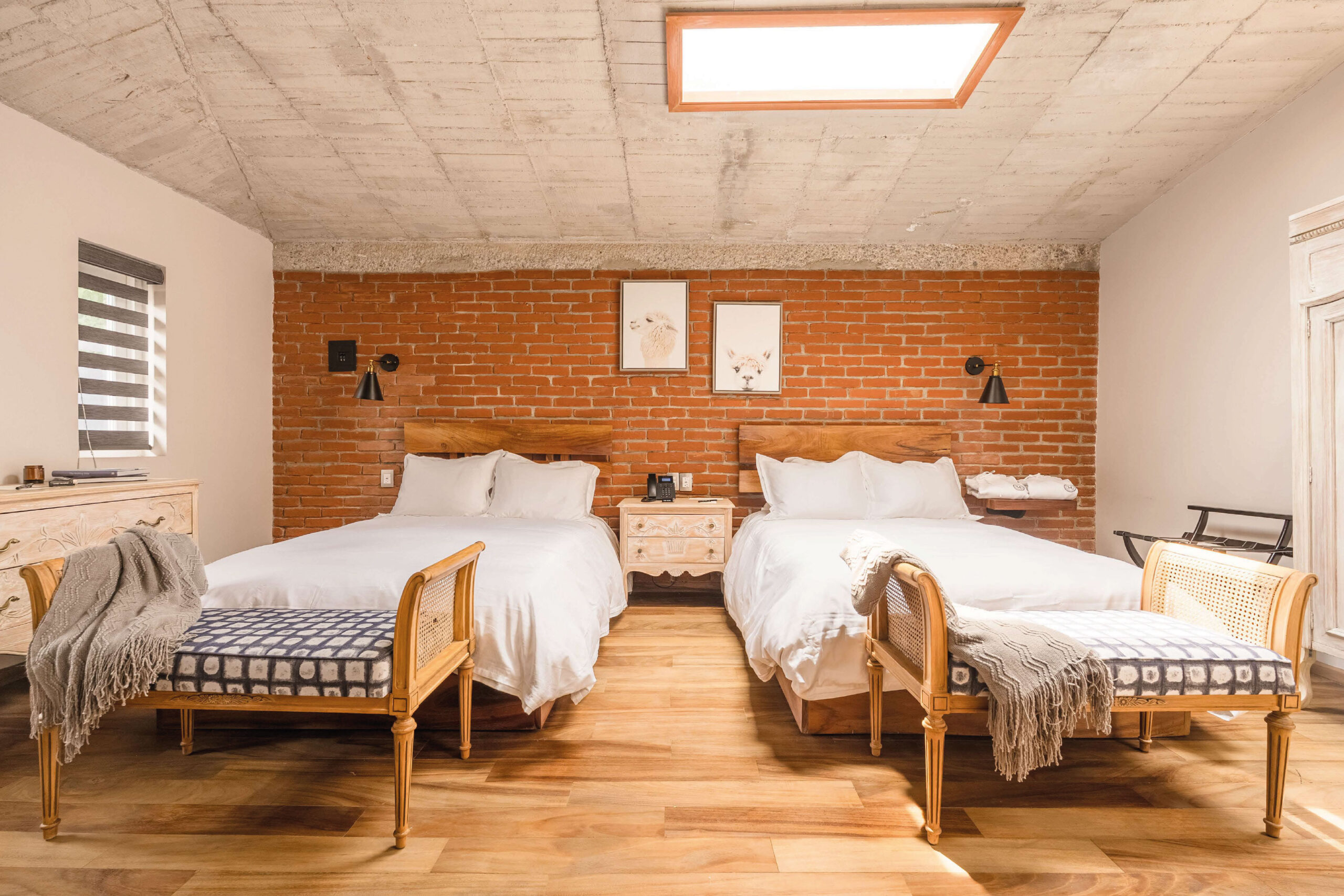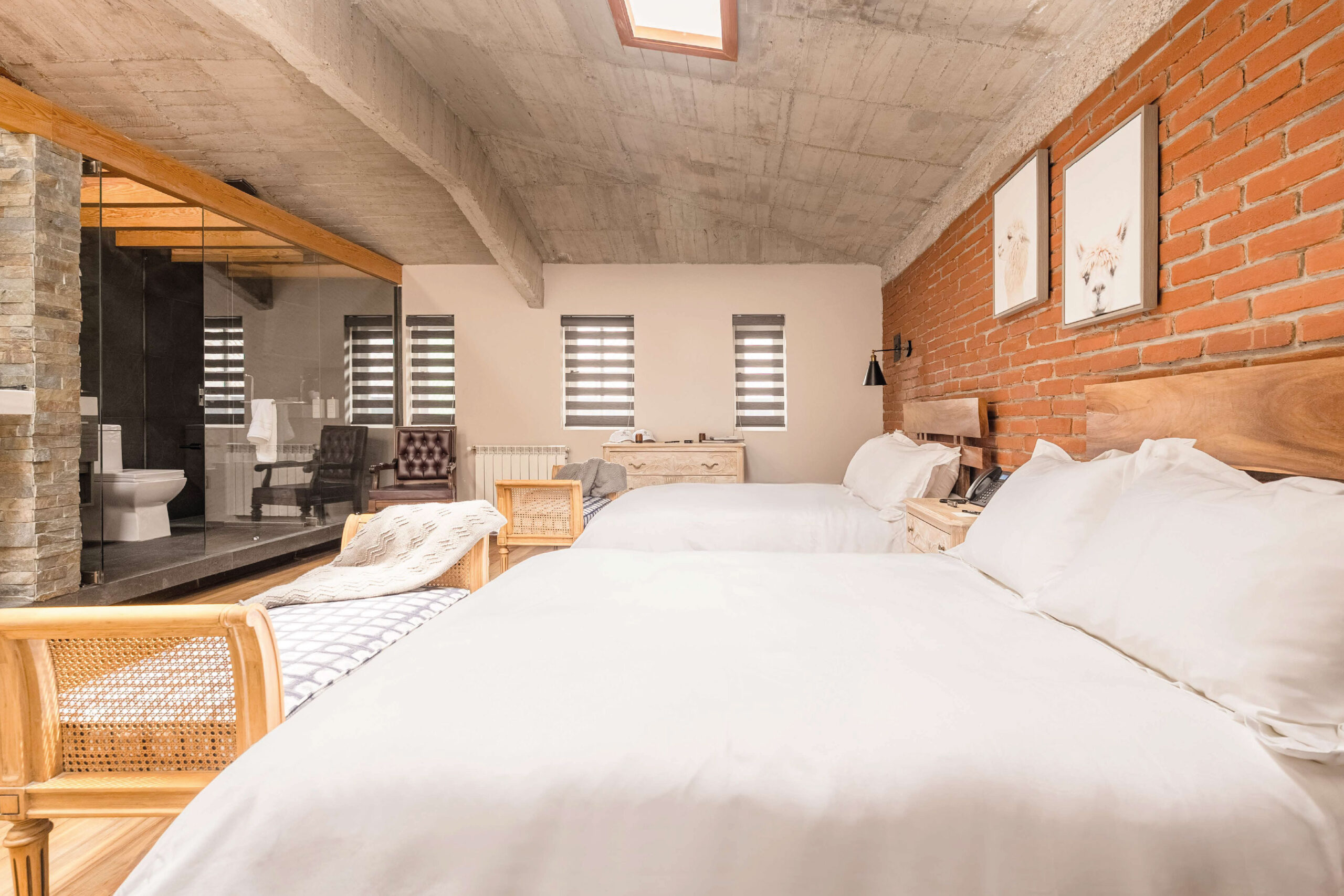 La Skylight Suite combina amplitud, calidez y estilo con un diseño que destaca por su muro de ladrillo, techos de concreto expuesto y un tragaluz que llena de luz natural cada rincón. Disponible con 2 camas matrimoniales, perfecta tanto para compartir como para disfrutar de mayor espacio personal. El baño con acabados modernos, la barra para bebidas y los muebles de madera tallada refuerzan esa sensación de confort práctico con toques de carácter.